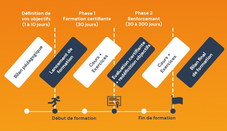 Lors de la mise en place de votre formation, votre conseiller définira une durée assez longue pour garantir une flexibilité répondant à vos propres contraintes professionnelles ou personnelles. En tout état de cause la formation suit un rythme cohérent à vos possibilités et à une certaine exigence pédagogique, rythme conforme à vos objectifs.